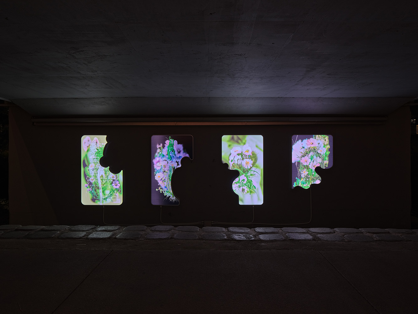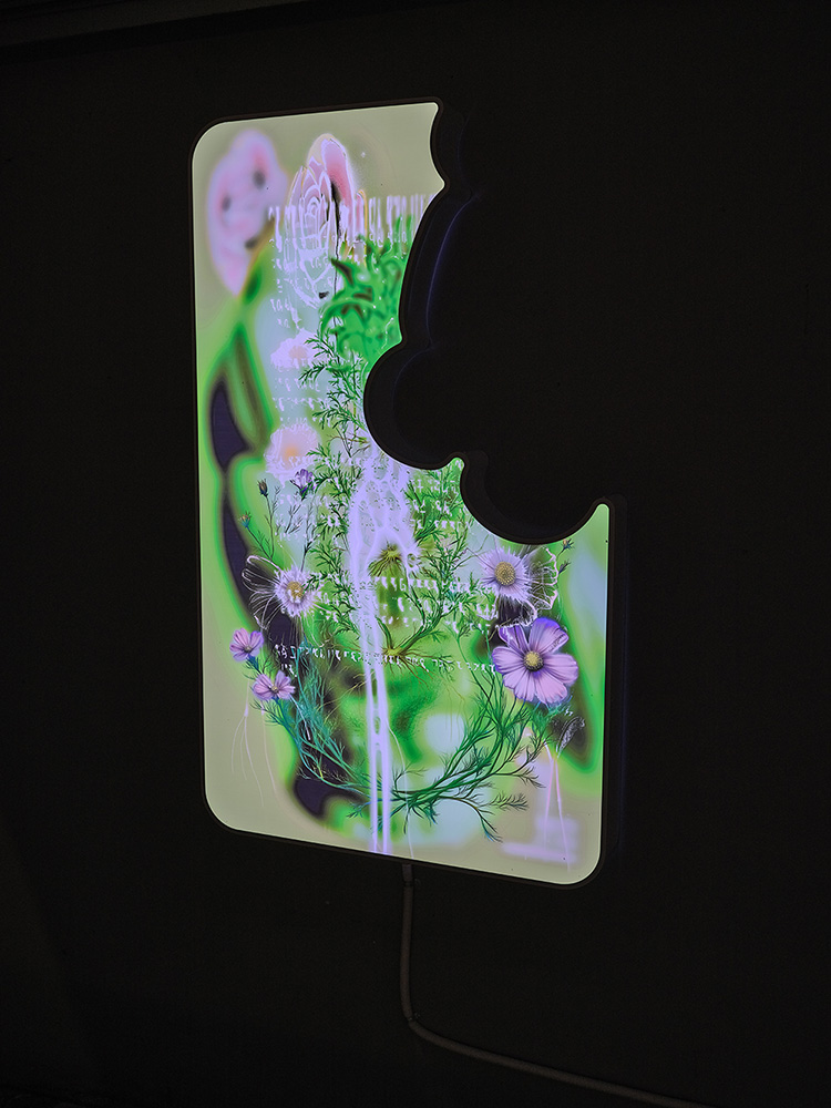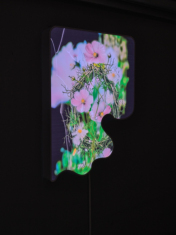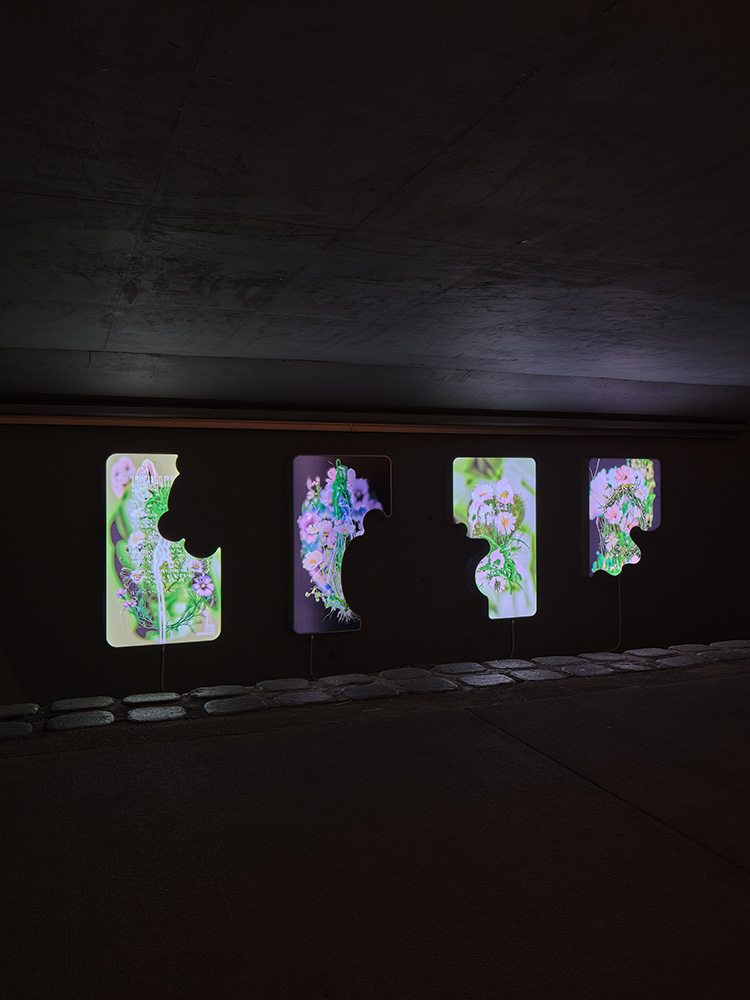 Ram Han captured the scenes she saw while walking, stored them in her memory, and later brought them out to create digital paintings, with a nostalgic touch. She captured the wildflowers and her eroded memories from walks along Danghyeon stream, installed them with a subtle glow, side by side on the wall. Her works, in which floral images intertwine with faint text, resemble faded greeting cards. They evoke the tender romanticism of her parents’ generation, who tenderly offered a single flower with their greetings.