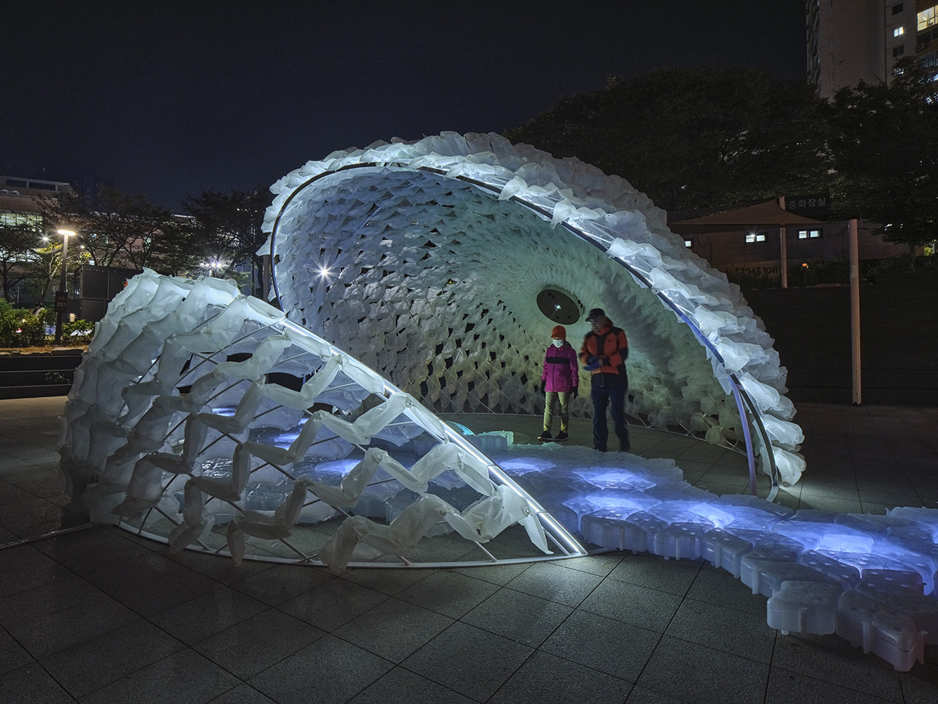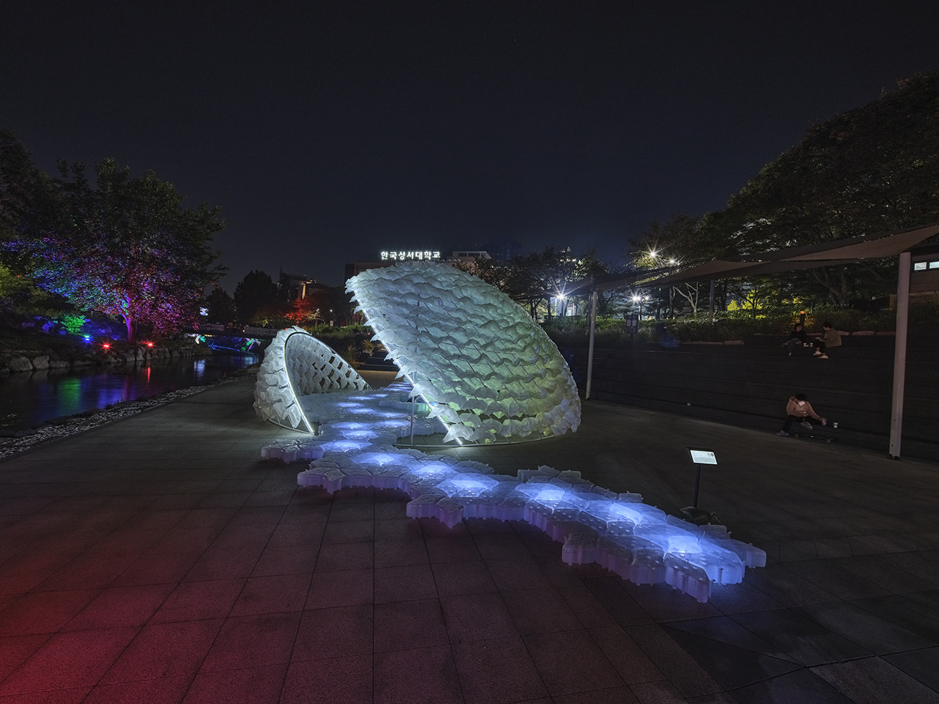 This artwork was created in collaboration with sound artist Kim Joon, filling the space with sounds collected from various places in Nowon-gu. The sounds of our daily lives become the breath of the artwork, infusing life into the city. Inside the structure, the surrounding scenes of Danghyeon stream subtly appear. In this way, the artwork reveals moments where artificiality and nature, the city and life, intersect along the path of the moon. How about entering this structure, where nature and artifice intertwine, and breathing together?