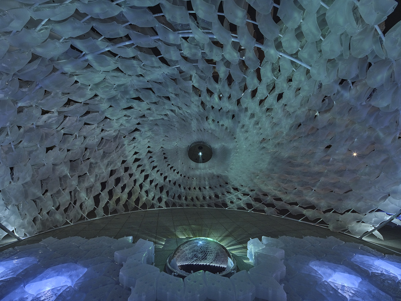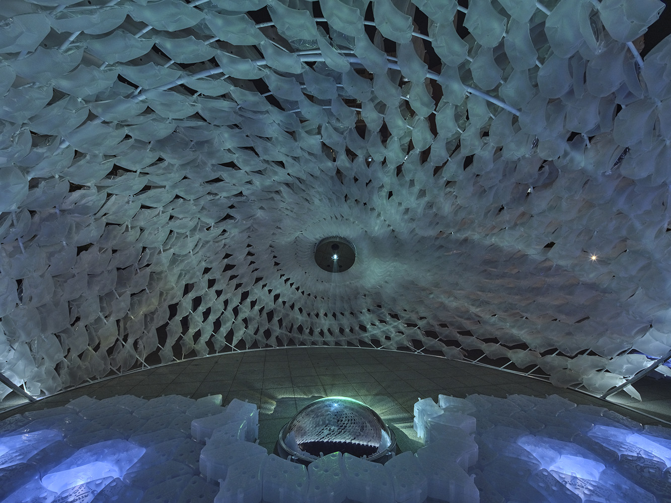 [Echoes in the Air] was created by the architectural group BARE. They were interested in the environmental issues caused by temporary structures. In seeking sustainable and ecological construction methods, they developed air sculptures that can be reused. [Echoes in the Air] is made from over 2,000 modular components. Though it is artificial, the work appears to breathe with nature, offering a temporary resting place here.
