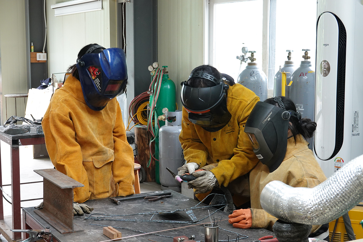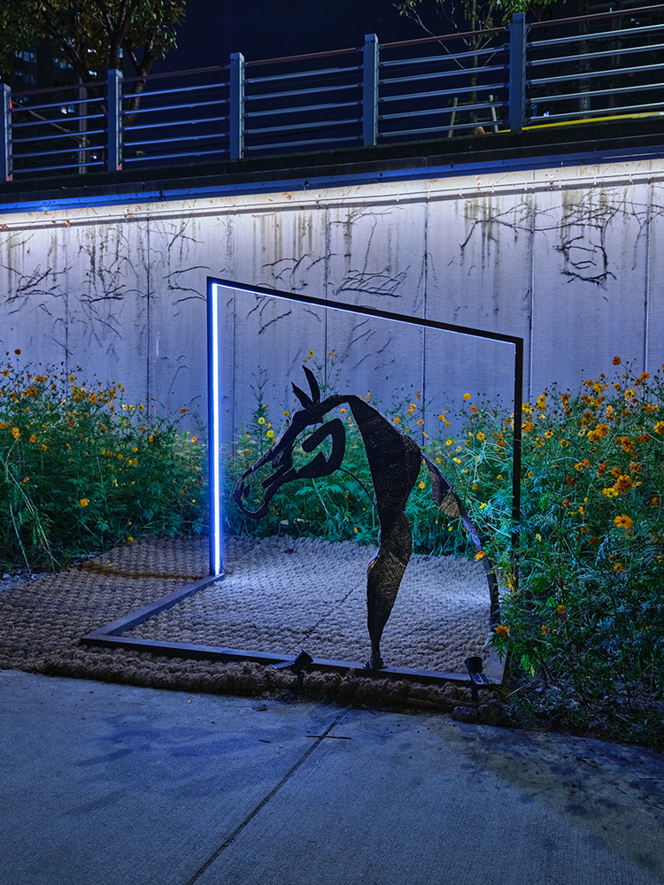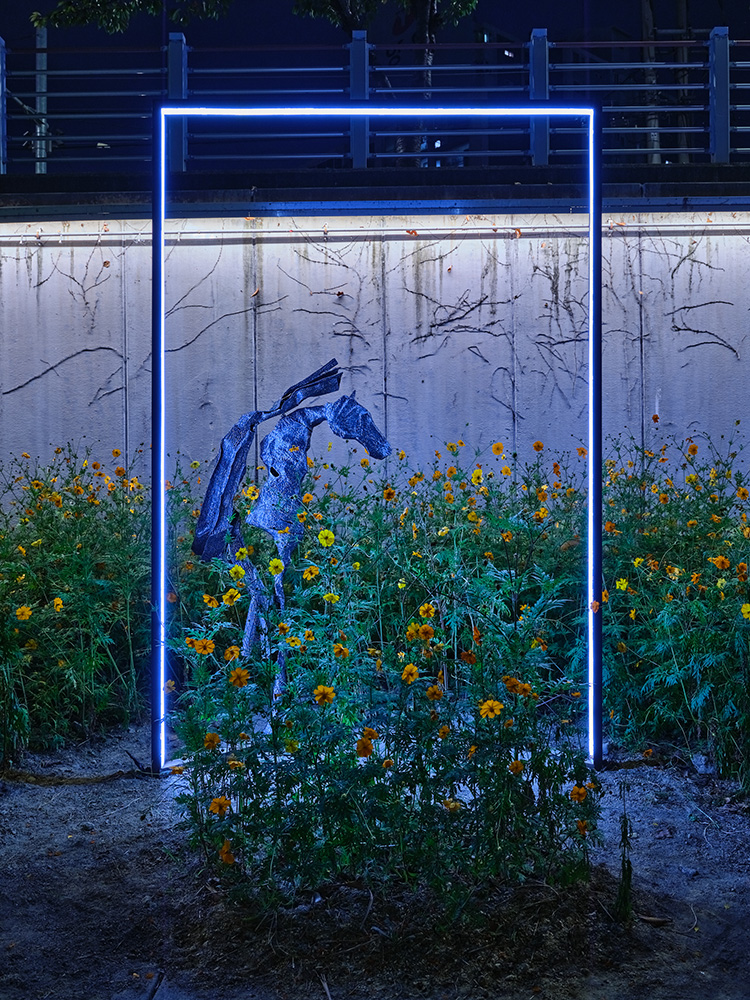 말(馬)을 주요 모티브로 삼아 아르곤 용접 기법으로 독특한 조형적 언어를 만든다. 용접 과정에서 나타나는 철의 물성 변형은 인간관계와 소통의 본질을 탐구하는 매개체가 된다. 기하학적 요소와 비정형적 구조를 통해 현대 사회의 불확 실성과 인간 존재의 불안정함을 표현하며, 말(馬)과 말(言)의 동음이의어를 활용해 보이는 것과 보이지 않는 것의 관 계를 시각화한다. 이를 통해 현대 사회의 복잡한 소통 구조와 인간관계의 다층적 측면을 예술적으로 해석해낸다.