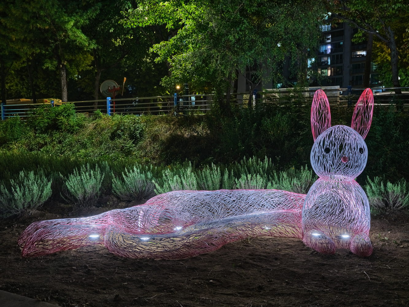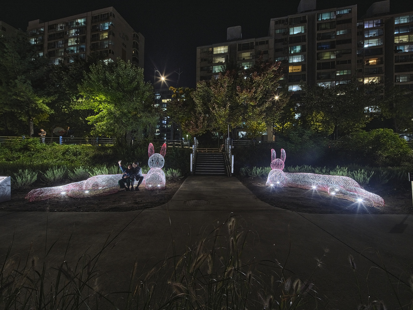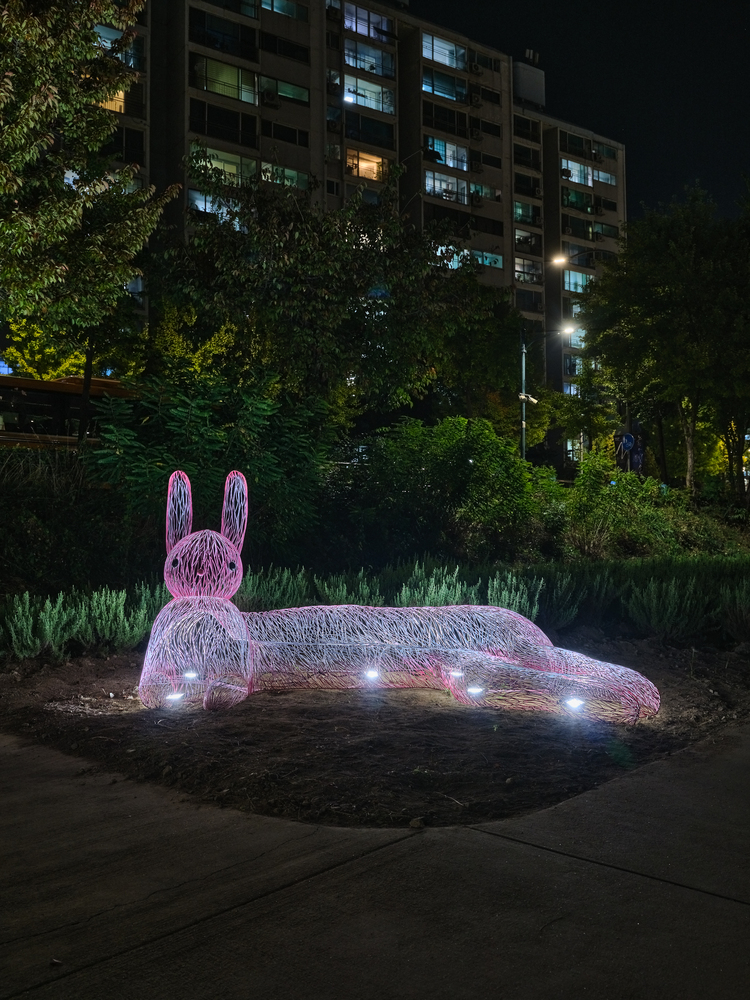 Designed and commissioned by the children of Sanggye Forest Community. The children imagined a family of animals with warm hearts who would make friends with everyone. They also wanted to create a piece where people could sit, rest and connect with each other. Cho Youngchul developed the children’s idea into a family of rabbits travelling from the moon to Nowon. The mother rabbit, stretching her long body, and the shy baby rabbit, sitting opposite her, become friends with the neighbours who pass by. Anyone can sit in the rabbits’ embrace and have a warm chat with their neighbours. You can also take a picture of the moment you meet the rabbit family. After all, they are here to meet you!