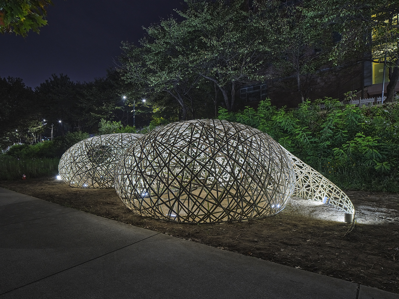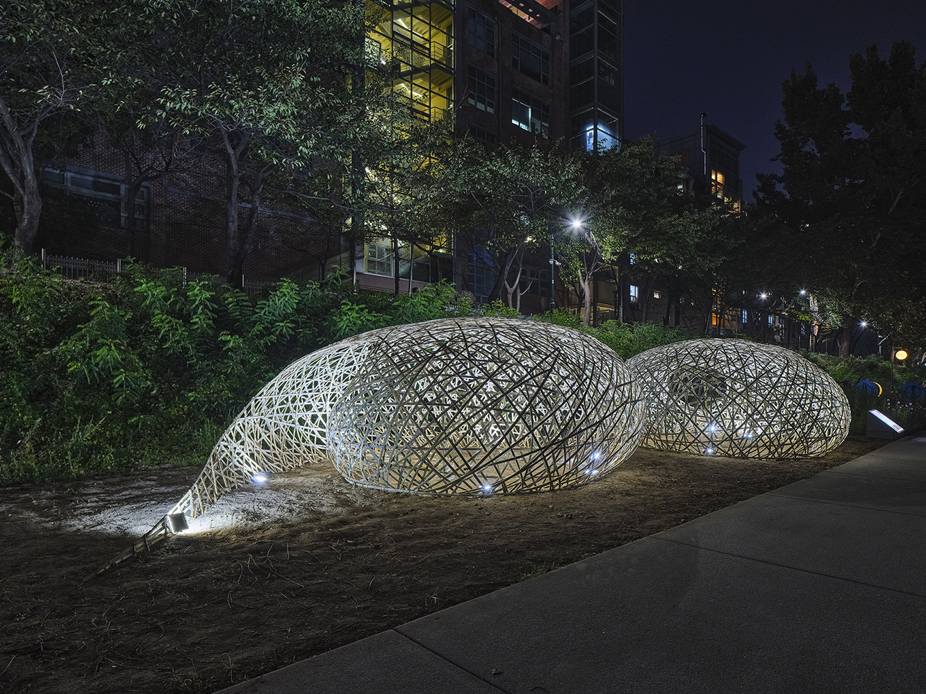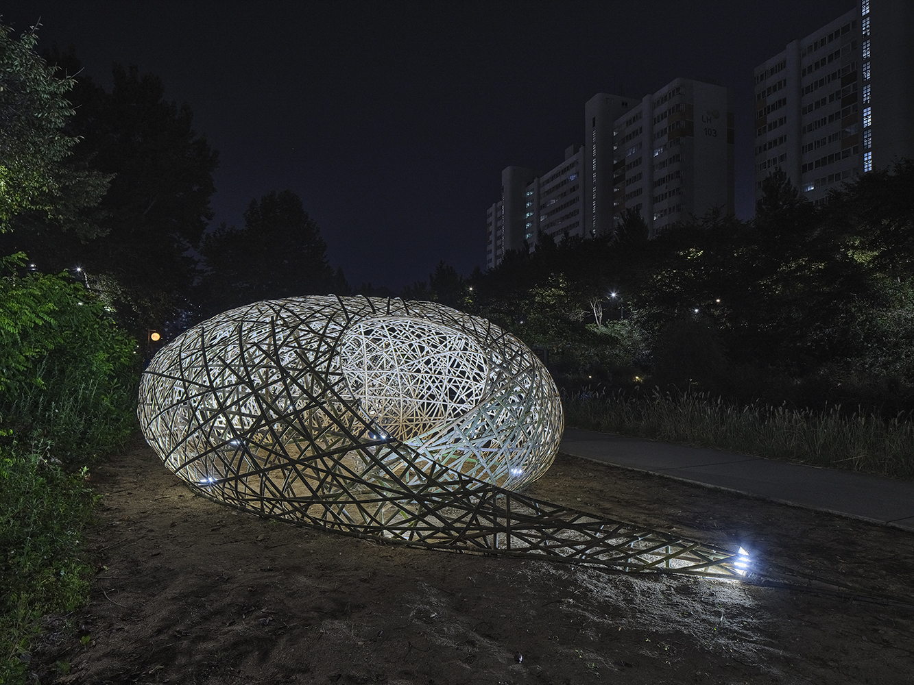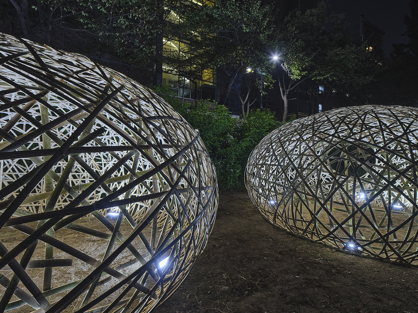 대나무를 엮어 만든 두 공간입니다. 박봉기 작가의 손에서 탄생한 이 공간은 원래부터 자연의 일부였던 것처럼 주변 환경에 녹아듭니다. 대나무를 엮은 교차점 사이로 숨쉬듯 바람이 드나들고, 우리도 그 안에 들어가 대나무와 함께 숨을 쉴 수 있습니다. 올해 노원달빛산책과 세 번째 만난 박봉기 작가는 이곳에 오래 머무르며 대나무를 쌓고 연결하며 작품을 만들었습니다. 햇볕을 적당히 가린 그늘 속에 흐르는 바람으로 사람과 자연의 상호작용을 느끼실 수 있습니다.
